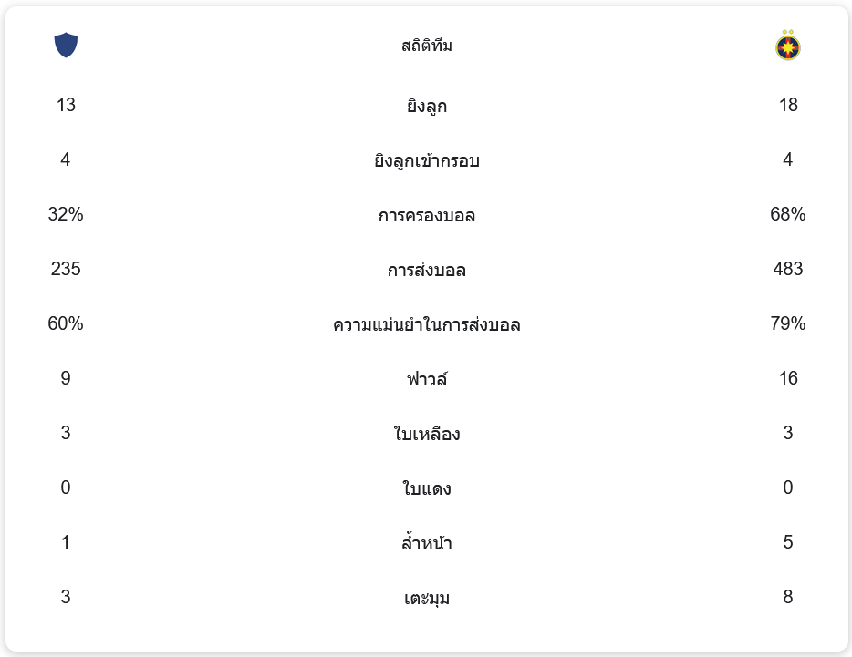 สเตอัว บูคาเรสต์ มีโอกาสยิงมากกว่าที่ 18 ครั้ง เทียบกับ 13 ครั้งของโบโตซานี่ แต่ทั้งสองทีมยิงเข้ากรอบเพียง 4 ครั้งเท่ากัน โบโตซานี่มีการครองบอลแค่ 32% แต่ใช้โอกาสสวนกลับอย่างมีประสิทธิภาพ และเปลี่ยนเป็นประตูชัยในท้ายที่สุด