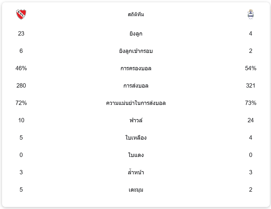 อินดิเพนเดนเต้มีโอกาสยิงถึง 23 ครั้ง แต่เข้ากรอบเพียง 6 ครั้ง ขณะที่กิมนาเซียมีโอกาสยิงเพียง 4 ครั้ง และเข้ากรอบ 2 ครั้ง กิมนาเซียครองบอลได้มากกว่า (54%) และมีความแม่นยำในการส่งบอลสูงถึง 73% แต่ไม่สามารถเจาะแนวรับของเจ้าบ้านได้