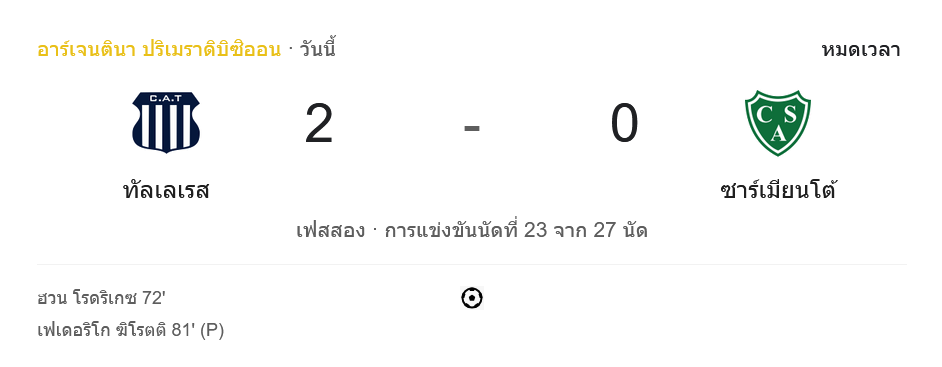 ศึกฟุตบอล อาร์เจนตินา พรีเมียร์ดิวิชั่น 2024 นัดที่ 23 ทัลเลเรส กอร์โดบา เปิดสนามรับการมาเยือนของ ซาร์เมียนโต้ โดยผลบอลสดในนัดนี้ ทัลเลเรส เอาชนะไปได้อย่างสวยงาม 2-0 จากประตูของ ฮวน โรดริเกซ นาทีที่ 72 และ เฟเดริโก ฆิโรตติ ที่สังหารจุดโทษในนาทีที่ 81 คว้าสามแต้มสำคัญได้สำเร็จ