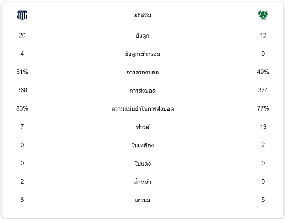 ทัลเลเรสครองบอล 51% สร้างโอกาสยิง 20 ครั้ง เข้ากรอบ 4 ครั้ง ในขณะที่ซาร์เมียนโต้มีโอกาสยิง 12 ครั้ง แต่ไม่เข้ากรอบเลย การจ่ายบอลที่แม่นยำและความดุดันในแดนหน้าของทัลเลเรสทำให้พวกเขาคว้าชัยชนะได้ในที่สุด