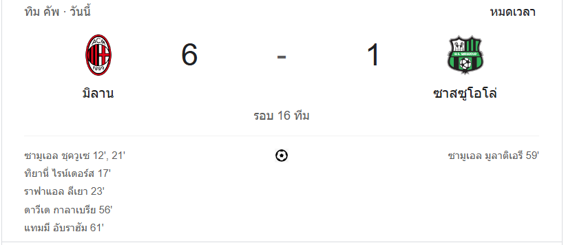 นาทีที่ 90+2: ผู้ตัดสินเป่าหมดเวลา มิลานถล่มซัสเซาโล่ไปด้วยสกอร์ 6-1