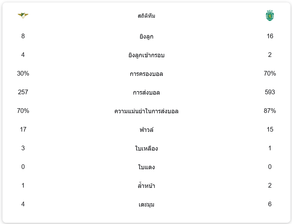 เกมนี้ สปอร์ติ้ง ลิสบอน ครองบอลได้ถึง 70% ส่งบอลสำเร็จมากถึง 593 ครั้ง เทียบกับ โมไรเรนเซ่ ที่ส่งบอลเพียง 257 ครั้ง แต่ความแม่นยำในการจบสกอร์ของเจ้าบ้านคือสิ่งที่สร้างความแตกต่าง