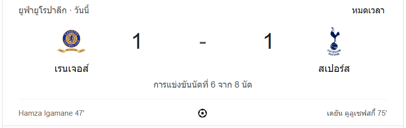 นาทีที่ 93: จบเกม ผู้ตัดสินเป่านกหวีดสุดท้าย เรนเจอร์สเสมอสเปอร์สไปด้วยสกอร์ 1-1