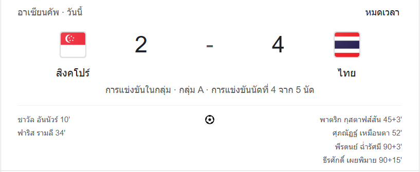 ผลบอลสด ระหว่าง ทีม สิงคโปร์ vs ไทย วันนี้ 17/12/67 ดูบอลย้อนหลัง คลิปไฮไลท์ ดูบอลอาเซียนฟุตบอลแชมเปียนชิพ 2024