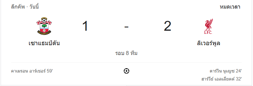 ลิเวอร์พูลแสดงให้เห็นถึงความเฉียบคมและเด็ดขาดในเกมบุก โดยเฉพาะครึ่งแรกที่พวกเขาฉวยโอกาสขึ้นนำถึงสองลูก แม้เซาท์แฮมป์ตันจะฮึดสู้อย่างเต็มที่ในครึ่งหลังและไล่ตีไข่แตก แต่ก็ไม่สามารถทำประตูเพิ่มได้ จบเกม ผลบอลสด เป็นทาง “หงส์แดง” บุกชนะ 2-1 พร้อมตีตั๋วเข้าสู่รอบรองชนะเลิศได้สำเร็จ
