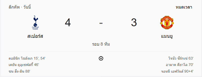 เกมที่เต็มไปด้วยจังหวะสำคัญและความตื่นเต้นตั้งแต่นาทีแรกจนวินาทีสุดท้าย ทำให้ศึกครั้งนี้กลายเป็นแมตช์ที่แฟนบอลจะต้องพูดถึงไปอีกนาน ด้วยชัยชนะครั้งนี้ ท็อตแน่ม ฮ็อทสเปอร์ ได้ทะลุเข้าสู่รอบรองชนะเลิศ ขณะที่แมนเชสเตอร์ ยูไนเต็ดต้องกลับบ้านพร้อมความผิดหวัง