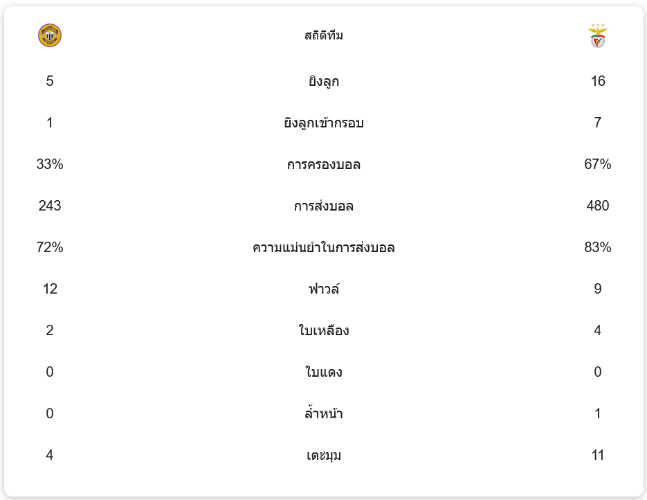 เบนฟิก้าครองบอลถึง 67% และจ่ายบอลสำเร็จ 480 ครั้ง ยิงทั้งหมด 16 ครั้ง เข้ากรอบ 7 ครั้ง ขณะที่นาซิอองนาลครองบอลเพียง 33% จ่ายบอลสำเร็จ 243 ครั้ง ยิงทั้งหมด 5 ครั้ง แต่เข้ากรอบเพียง 1 ครั้ง