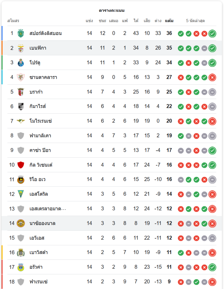 เบนฟิก้ายังคงรั้งอันดับสองของตาราง ด้วยคะแนน 35 แต้มจาก 14 นัด ไล่ตามจ่าฝูงอย่าง สปอร์ติง ลิสบอน เพียงแต้มเดียว ขณะที่นาซิอองนาลยังคงอยู่ในโซนท้ายตารางที่อันดับ 14