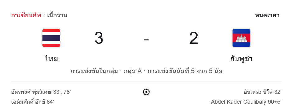 จาก : ผลบอลสด อาเซียนฟุตบอลแชมเปียนชิพ 2024 ระหว่าง ไทย 3-2 กัมพูชา วันนี้ 20/12/67 – บ้านกีฬา