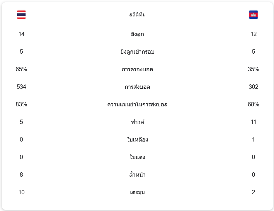 ไทยครองบอลได้ถึง 65% มีโอกาสยิง 14 ครั้ง โดยเข้ากรอบ 5 ครั้ง ขณะที่กัมพูชามีโอกาสยิง 12 ครั้ง เท่ากับจำนวนเข้ากรอบ 5 ครั้ง แต่ความแม่นยำในการส่งบอลของไทยเหนือกว่าอยู่ที่ 83% เทียบกับกัมพูชาที่ 68%