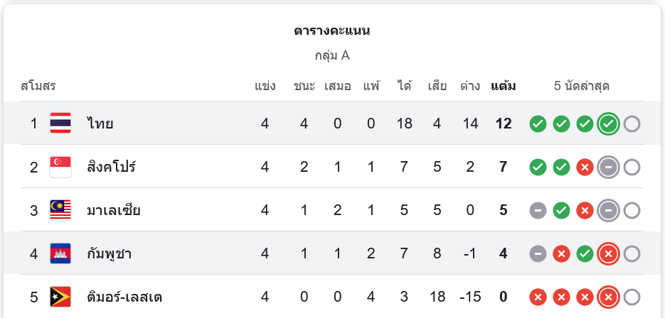 ชัยชนะครั้งนี้ทำให้ไทยจบอันดับหนึ่งในกลุ่ม A ด้วย 12 คะแนนเต็ม ขณะที่กัมพูชาจบอันดับที่ 4 มีเพียง 4 คะแนน