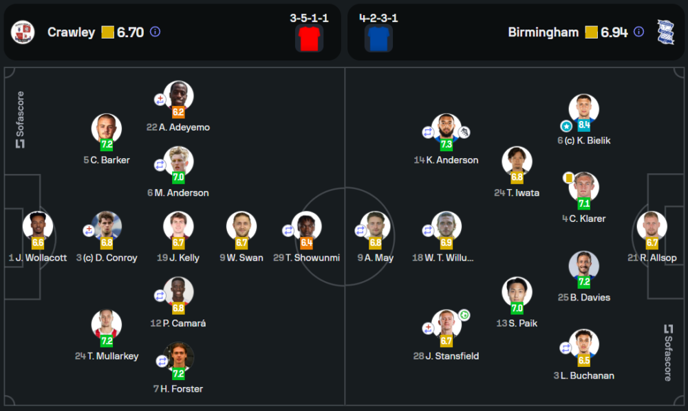 เกมนี้ เบอร์มิงแฮม มาในแผน 4-2-3-1 เน้นการโจมตีจากปีกซ้ายและการสนับสนุนจากมิดฟิลด์ตัวรุก ขณะที่ คราวเลย์ ใช้แผน 3-5-1-1 แต่กลับมีปัญหาในการปิดช่องว่างในแดนกลาง ทำให้ทีมเยือนสามารถครองบอลได้มากถึง 62% และสร้างโอกาสจบสกอร์ได้ดีกว่า