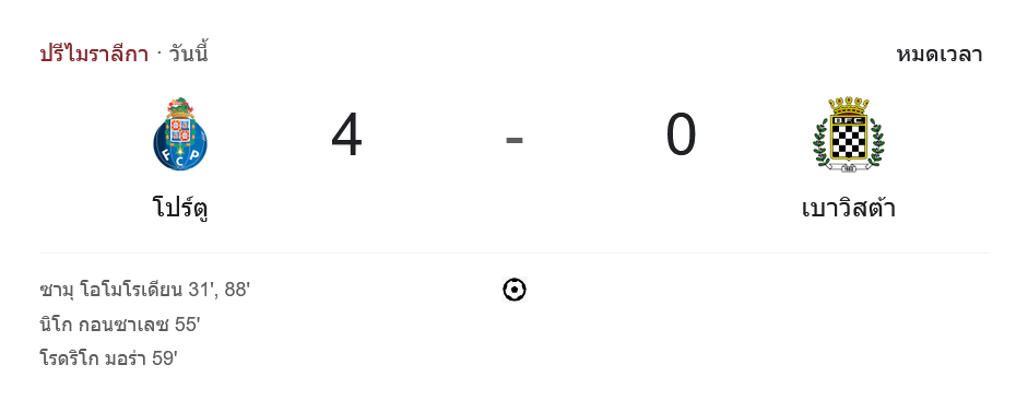 บ้านผลบอล สรุปผล ปอร์โต้ถล่ม เบาวิสต้า 4-0 ครองจ่าฝูงปรีไมราลีกา 2024