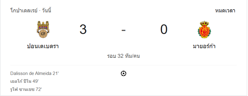 นาทีที่ 95: จบเกม ปอนเตเบดราเอาชนะมายอร์ก้า 3-0