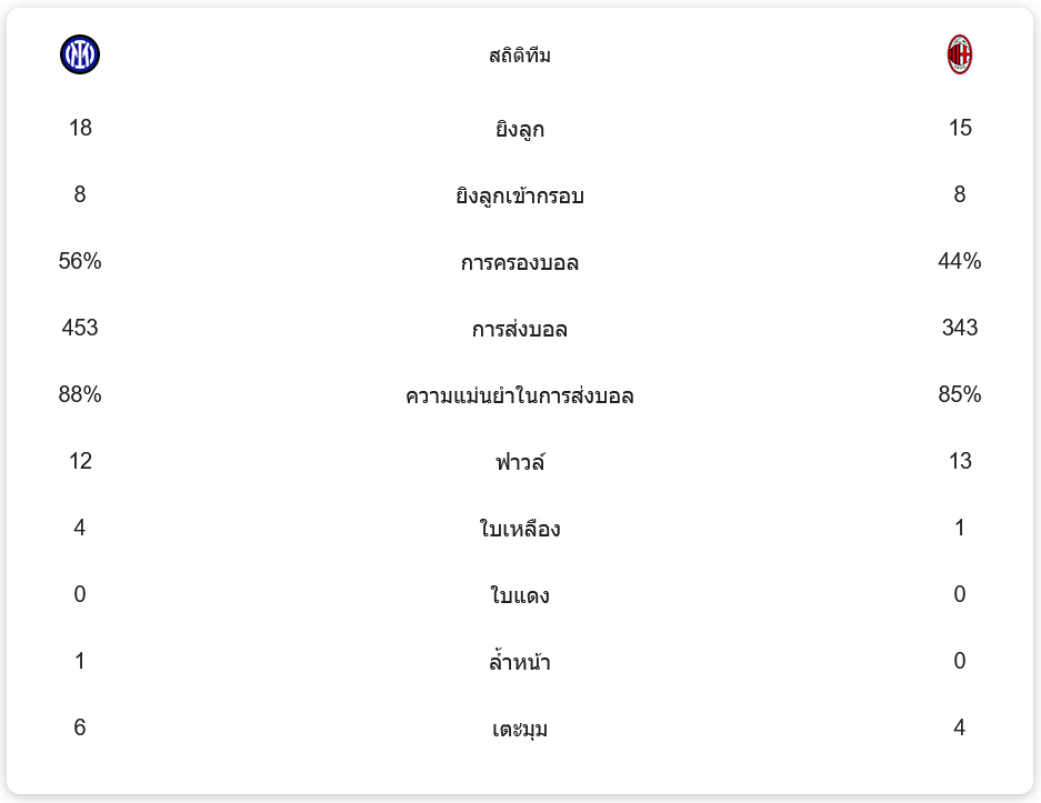 เกมนี้อินเตอร์ มิลาน ครองบอลได้มากกว่าที่ 56% และยิงรวม 18 ครั้งเท่ากับมิลาน แต่เอซี มิลานใช้โอกาสอย่างคุ้มค่า และสามารถยิงเข้ากรอบได้เท่ากันที่ 8 ครั้ง ซึ่งแสดงให้เห็นถึงความแม่นยำในจังหวะจบสกอร์ของทั้งสองทีม