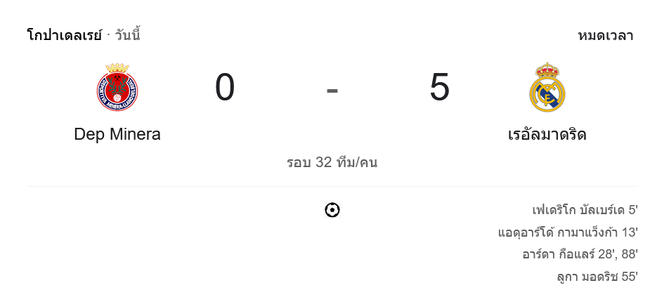 จาก : ผลบอลสด โกปาเดลเรย์ 2024 ระหว่าง เดปอร์ติวา มีเนอร่า 0-5 เรอัล มาดริด วันนี้ 7/1/68 – บ้านกีฬา