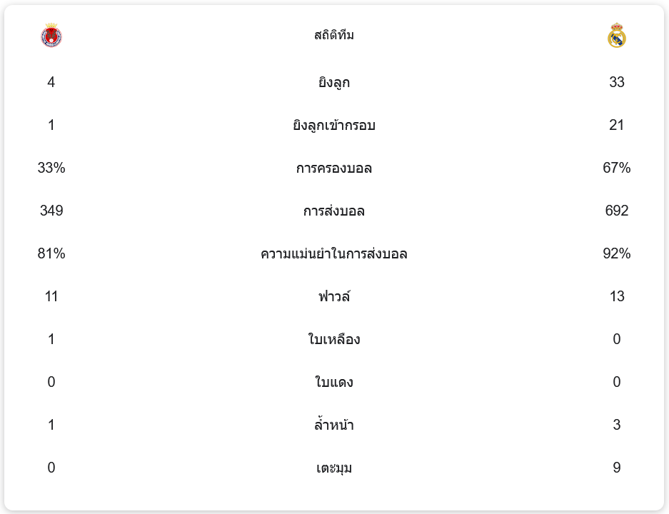เรอัล มาดริด ครองบอลถึง 67% และยิงถึง 33 ครั้ง โดยเข้ากรอบ 21 ครั้ง ขณะที่ เดปอร์ติวา มีเนอร่า มีโอกาสยิงเพียง 4 ครั้ง และเข้ากรอบเพียง 1 ครั้ง แสดงให้เห็นถึงความแตกต่างอย่างชัดเจนในเกมนี้