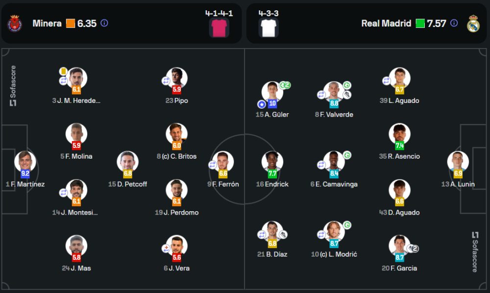 เรอัล มาดริด ใช้แผน 4-3-3 เน้นเกมรุกจากกองกลางตัวสร้างสรรค์อย่าง ลูก้า โมดริช และ บัลเบร์เด้ ซึ่งทำให้เกมรุกมีมิติและหลากหลาย ขณะที่ เดปอร์ติวา มีเนอร่า เน้นตั้งรับด้วยแผน 4-1-4-1 แต่การประสานงานยังขาดความแม่นยำ วิเคราะห์จากเกมนี้ มาดริดแสดงให้เห็นถึงความเด็ดขาดในจังหวะจบสกอร์และความสามารถในการสร้างโอกาสที่เหนือชั้นกว่า
