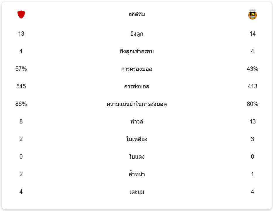 เกมนี้กิล วิเซนเต้มีโอกาสยิง 13 ครั้ง เข้ากรอบ 4 ครั้ง ส่วนริโอ อาฟมีโอกาสยิง 14 ครั้ง เข้ากรอบ 4 ครั้งเช่นกัน การครองบอลเป็นของเจ้าบ้านที่ 57% ขณะที่ริโอ อาฟครองบอล 43% การผ่านบอลของกิล วิเซนเต้แม่นยำถึง 86% และริโอ อาฟอยู่ที่ 80% สะท้อนถึงเกมที่สูสีกันอย่างชัดเจน