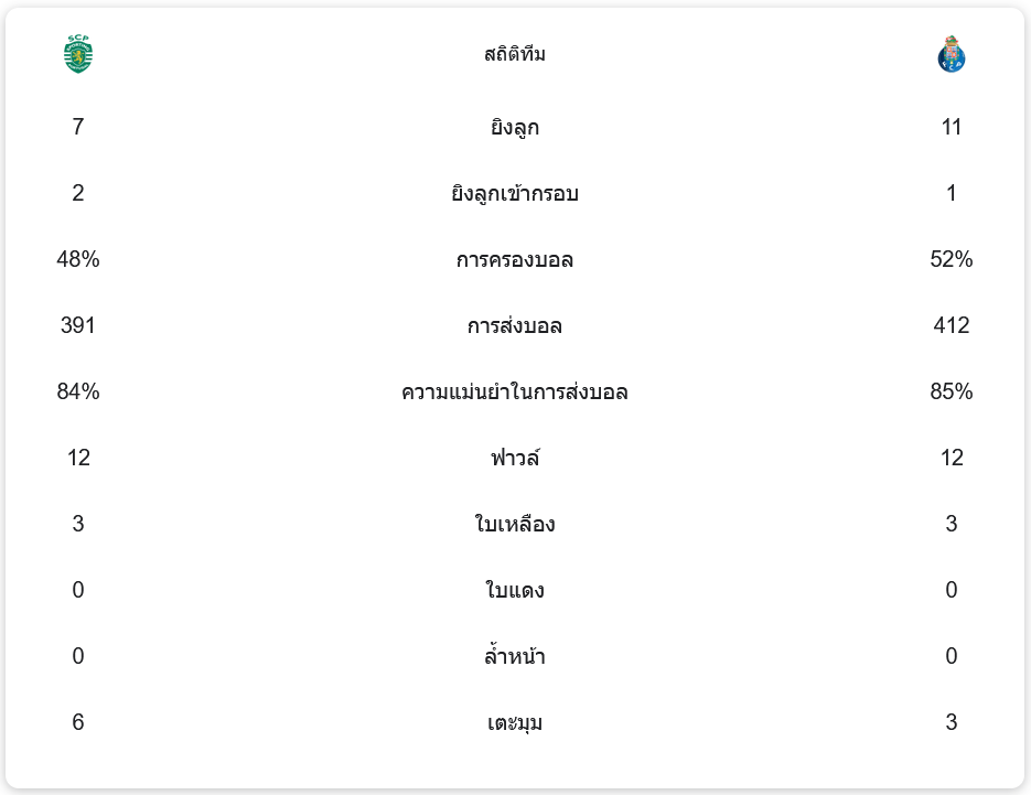 ปอร์โต้มีการครองบอลมากกว่าเล็กน้อยที่ 52% แต่มีโอกาสยิง 11 ครั้ง ตรงกรอบเพียง 1 ครั้ง ขณะที่ลิสบอนมีโอกาสยิง 7 ครั้ง ตรงกรอบ 2 ครั้ง ความแม่นยำในการส่งบอลของทั้งสองทีมอยู่ที่ 84% และ 85% ตามลำดับ การเล่นที่แน่นหนาในเกมรับของลิสบอนทำให้พวกเขาสามารถรักษาคลีนชีตได้สำเร็จ