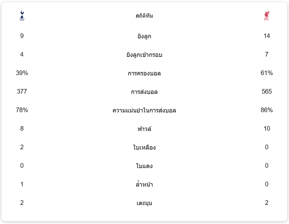 ลิเวอร์พูลครองบอลถึง 61% และสร้างโอกาสยิงได้ 14 ครั้ง ขณะที่สเปอร์สมีโอกาสยิงเพียง 9 ครั้ง แต่ใช้ความเฉียบคมในช่วงท้ายเกมได้ดีกว่า การส่งบอลของลิเวอร์พูลแม่นยำถึง 86% แต่สเปอร์สใช้เกมรับที่รัดกุมป้องกันไว้ได้ทั้งหมด