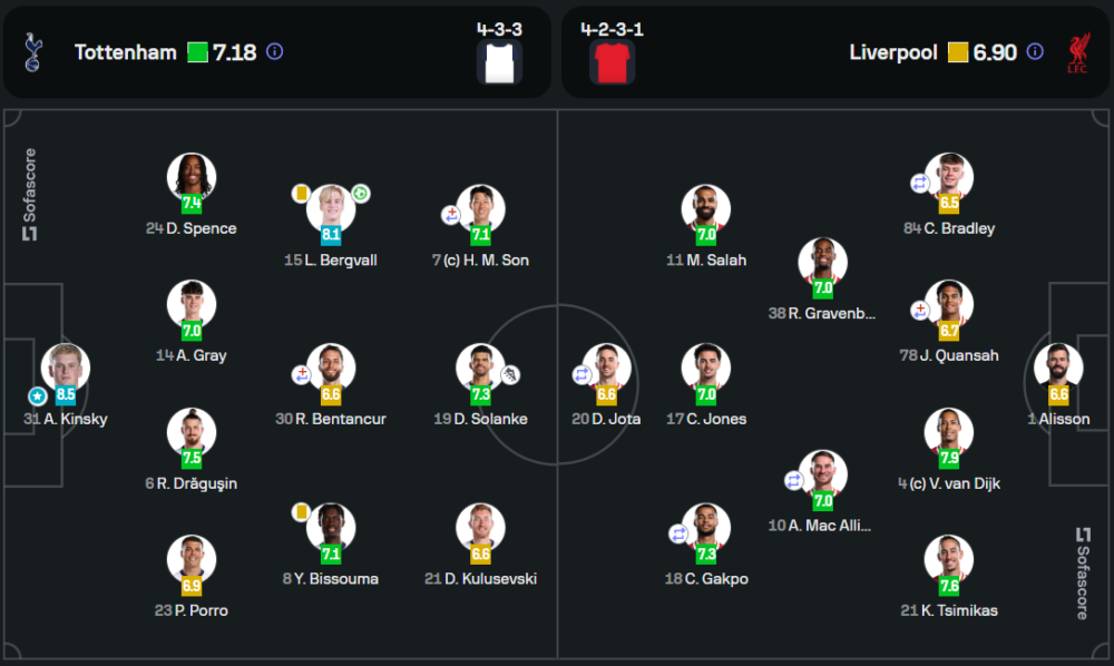 สเปอร์สเลือกใช้แผน 4-3-3 เน้นการตั้งรับลึกและสวนกลับเร็ว ซึ่งทำให้ลิเวอร์พูลที่เล่นด้วยระบบ 4-2-3-1 ต้องเจอกับความยากลำบากในพื้นที่แดนสุดท้าย การวางตำแหน่งของ ลูคัส แบร์กวาลล์ และ โดมินิก โซลันเก้ ที่เล่นเกมโต้กลับได้อย่างรวดเร็วถือเป็นจุดเปลี่ยนสำคัญ ขณะที่ลิเวอร์พูลพยายามเน้นการครองบอลและเปิดเกมรุกจากริมเส้น แต่ยังขาดความแม่นยำในจังหวะสุดท้าย