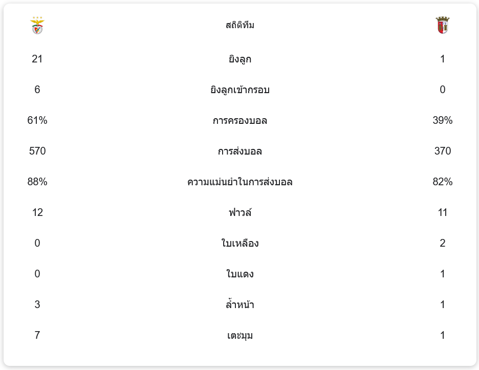 เบนฟิก้าครองบอลถึง 61% และสร้างโอกาสยิงได้มากถึง 21 ครั้ง โดยเข้ากรอบ 6 ครั้ง ส่วนสปอร์ติ้ง บราก้ามีโอกาสยิงเพียง 1 ครั้ง และไม่เข้ากรอบเลย การส่งบอลของเบนฟิก้ามีความแม่นยำถึง 88% ซึ่งแสดงถึงความเหนือชั้นในเกมนี้