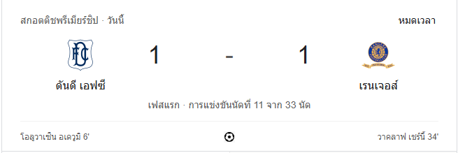 นาทีที่ 47: จบครึ่งแรก ดันดี เอฟซีเสมอกับเรนเจอร์ส 1-1