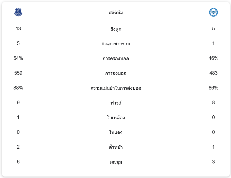 เอฟเวอร์ตันมีโอกาสยิงทั้งหมด 13 ครั้ง เข้ากรอบ 5 ครั้ง ครองบอล 54% และผ่านบอลสำเร็จถึง 88% ในขณะที่ปีเตอร์โบโร่มีโอกาสยิงเพียง 5 ครั้ง และครองบอล 46% สถิติแสดงให้เห็นถึงความเหนือกว่าของเจ้าบ้านอย่างชัดเจน