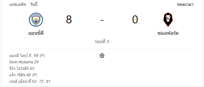 นาทีที่ 90+2: ผู้ตัดสินเป่านกหวีดหมดเวลา จบเกม แมนเชสเตอร์ ซิตี้ เอาชนะ ซอลฟอร์ด ซิตี้ ด้วยสกอร์ 8-0