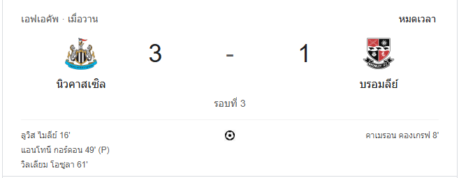 บ้านกีฬา รายงานผลบอลสดจากศึกเอฟเอคัพ 2024 รอบที่ 3 เมื่อคืนนี้ นิวคาสเซิ่ล ยูไนเต็ด เปิดบ้านเซนต์ เจมส์ พาร์ค ต้อนรับการมาเยือนของ บรอมลีย์ แม้ว่าทีมเยือนจะสร้างเซอร์ไพรส์ขึ้นนำก่อนในช่วงต้นเกม แต่เจ้าบ้านพลิกสถานการณ์ด้วยฟอร์มการเล่นอันยอดเยี่ยมของ ลูอิส ไมลีย์, แอนโธนี กอร์ดอน และ วิลเลียม โอซูล่า ที่ช่วยกันทำสามประตู พลิกกลับมาคว้าชัย 3-1 ได้สำเร็จ ส่งผลให้นิวคาสเซิ่ลผ่านเข้าสู่รอบต่อไปอย่างสวยงาม