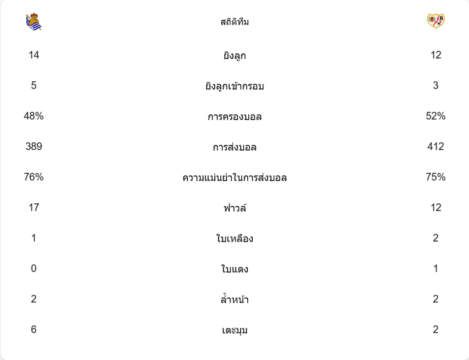 แม้ว่า ราโย่ บาเยกาโน่ จะครองบอลมากกว่าเล็กน้อยที่ 52% เทียบกับโซเซียดาดที่ 48% แต่เจ้าบ้านมีโอกาสยิงมากกว่า 14 ครั้ง เทียบกับทีมเยือนที่มี 12 ครั้ง การจ่ายบอลของทั้งสองทีมใกล้เคียงกัน โดยโซเซียดาดมีความแม่นยำ 76% ส่วนราโย่ บาเยกาโน่มีความแม่นยำ 75%