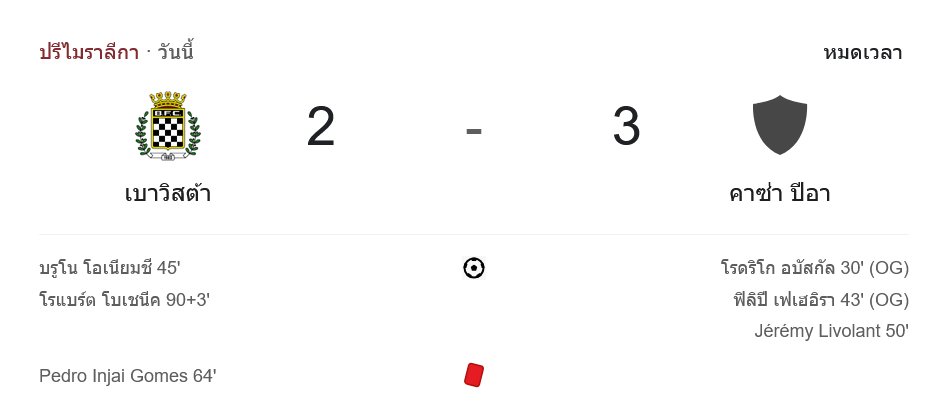 • ใบแดง: เบาวิสต้า 1 – 0 คาซ่า เพีย