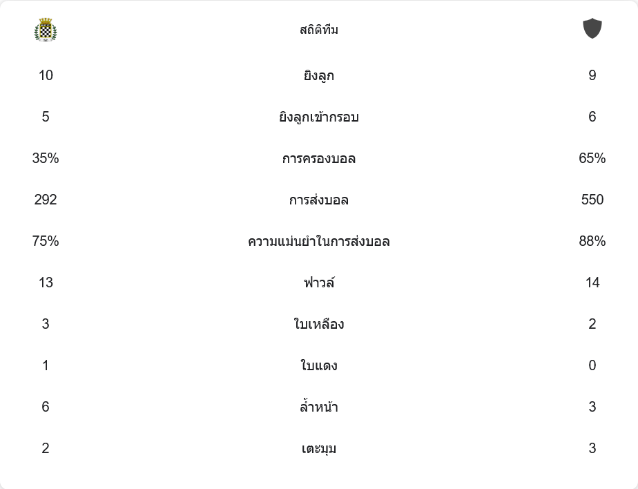 • จำนวนครั้งที่ยิง: เบาวิสต้า 10 – 9 คาซ่า เพีย