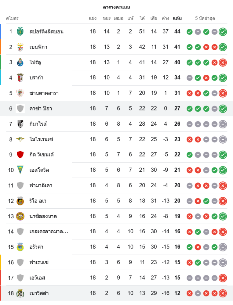ชัยชนะของ คาซ่า เพีย ทำให้พวกเขาเก็บเพิ่มเป็น 27 คะแนน รั้งอันดับ 6 ส่วน เบาวิสต้า ยังจมอยู่ท้ายตารางที่อันดับ 18 มีเพียง 12 แต้มเท่านั้น