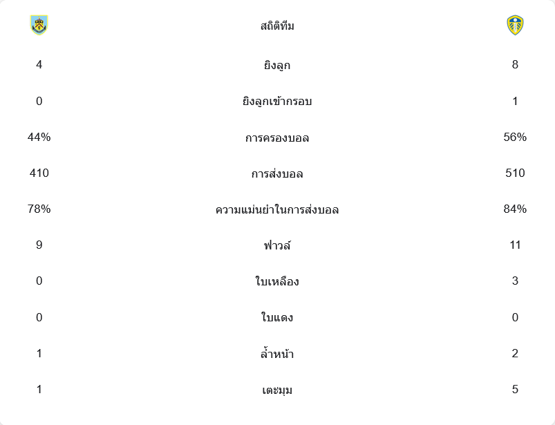 แม้ว่า ลีดส์ ยูไนเต็ด จะครองบอลได้มากกว่าที่ 56% แต่พวกเขากลับมีโอกาสยิงเข้ากรอบเพียง 1 ครั้ง จากโอกาสทั้งหมด 8 ครั้ง แสดงให้เห็นถึงปัญหาการจบสกอร์ที่ยังไม่เฉียบคม ในขณะที่ เบิร์นลี่ย์ แม้จะยิงได้น้อยกว่าที่ 4 ครั้ง แต่ไม่มีโอกาสยิงเข้ากรอบเลย ซึ่งสะท้อนปัญหาในแนวรุกอย่างชัดเจน