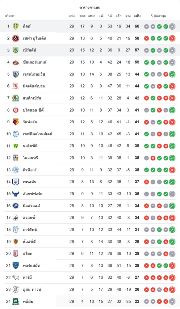หลังจบเกมนี้ ลีดส์ ยูไนเต็ด ยังคงรั้งจ่าฝูงมี 60 คะแนน จาก 29 นัด นำห่างอันดับสอง เชฟฟิลด์ ยูไนเต็ด เพียง 2 คะแนนเท่านั้น ขณะที่ เบิร์นลี่ย์ รั้งอันดับ 3 มี 57 คะแนน ยังอยู่ในเส้นทางลุ้นเลื่อนชั้นต่อไป