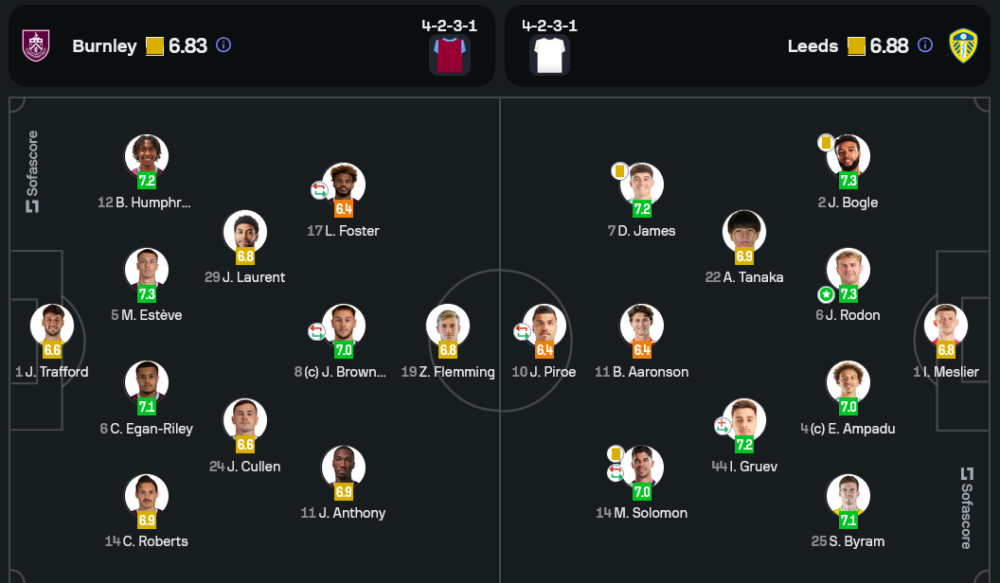 ลีดส์ ยูไนเต็ด เป็นฝ่ายที่เหนือกว่าเล็กน้อยในการครองบอลที่ 56% และมีอัตราการส่งบอลแม่นยำ 84% มากกว่าเบิร์นลี่ย์ที่ทำได้เพียง 78% ขณะที่โอกาสยิงทั้งหมด ลีดส์ ยิงไป 8 ครั้ง ส่วน เบิร์นลี่ย์ ยิง 4 ครั้ง และที่น่าสนใจคือ ไม่มีทีมไหนยิงเข้ากรอบเกิน 1 ครั้งเลย