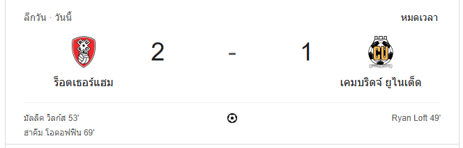 แม้ เคมบริดจ์ ยูไนเต็ด จะขึ้นนำไปก่อน แต่ ร็อตเธอร์แฮม ยูไนเต็ด ไม่ยอมแพ้ แสดงให้เห็นถึงความแข็งแกร่งของทีมที่สามารถพลิกเกมได้ โดยสองประตูสำคัญจาก วิลค์ส และ โอดอฟฟิน ทำให้พวกเขาคว้าสามแต้มสำคัญในบ้านได้อย่างสุดมันส์