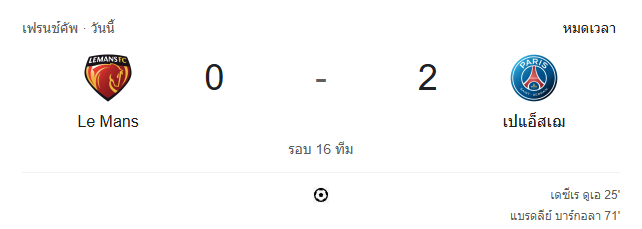 บ้านกีฬา พาคุณติดตามศึก กุปเดอฟร็องส์ 2024 รอบ 16 ทีมสุดท้าย เมื่อ เลอมังส์ ทีมจากลีกล่าง เปิดบ้านพบศึกหนักกับ ปารีส แซงต์-แชร์กแมง ทีมยักษ์ใหญ่แห่งลีกเอิง เกมนี้แม้เจ้าบ้านจะสู้เต็มที่ แต่สุดท้ายต้องพ่ายให้กับความเฉียบคมของ เปแอสเช ที่ได้ประตูจาก เดซิเร่ ดูเอ้ และ แบรดลีย์ บาร์โคล่า จบเกม เปแอสเชบุกชนะ 2-0 ตีตั๋วเข้าสู่รอบต่อไป