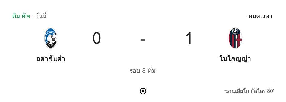ศึก โกปปาอีตาเลีย 2024 รอบ 8 ทีมสุดท้าย การพบกันระหว่าง อตาลันต้า เปิดบ้านรับมือ โบโลญญ่า กลายเป็นเกมสุดเข้มข้นที่เต็มไปด้วยจังหวะบีบหัวใจ แต่สุดท้ายเป็น โบโลญญ่า ที่เฉือนเอาชนะไปได้ 1-0 ด้วยประตูชัยในช่วงท้ายเกมจาก ซานเตียโก กัสโตร ทำเอาแฟนบอลที่ติดตาม ผลบอลสด ต้องลุ้นกันจนนาทีสุดท้าย