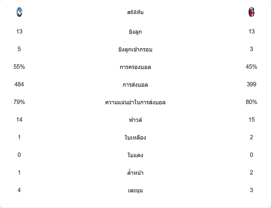 ทั้งสองทีมมีโอกาสยิงเท่ากันที่ 13 ครั้ง โดยอตาลันต้ามีโอกาสเข้ากรอบ 5 ครั้ง ส่วนโบโลญญ่าทำได้ 3 ครั้ง แม้อตาลันต้าจะครองบอลมากกว่า (55% ต่อ 45%) แต่ความแม่นยำในการส่งบอลของโบโลญญ่ากลับสูงกว่าเล็กน้อยที่ 80% เทียบกับ 79% ของอตาลันต้า การทำฟาวล์ในเกมนี้เกิดขึ้นบ่อยครั้ง แสดงให้เห็นถึงความเข้มข้นและดุดันของทั้งสองทีม