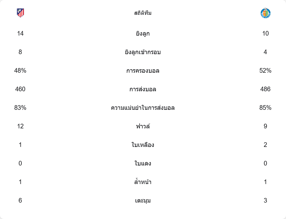 แม้แอตเลติโกจะครองบอลน้อยกว่า (48% เทียบกับ 52%) แต่จังหวะจบสกอร์ของพวกเขามีประสิทธิภาพสูง ยิงทั้งหมด 14 ครั้ง เข้ากรอบถึง 8 ครั้งและเปลี่ยนเป็น 5 ประตู ส่วนเคตาเฟ่มีโอกาสยิง 10 ครั้ง เข้ากรอบ 4 ครั้งแต่ไม่สามารถเปลี่ยนเป็นประตูได้เลย อัตราความแม่นยำในการส่งบอลของทั้งสองทีมอยู่ในระดับใกล้เคียงกัน โดยแอตเลติโกที่ 83% และเคตาเฟ่ที่ 85%