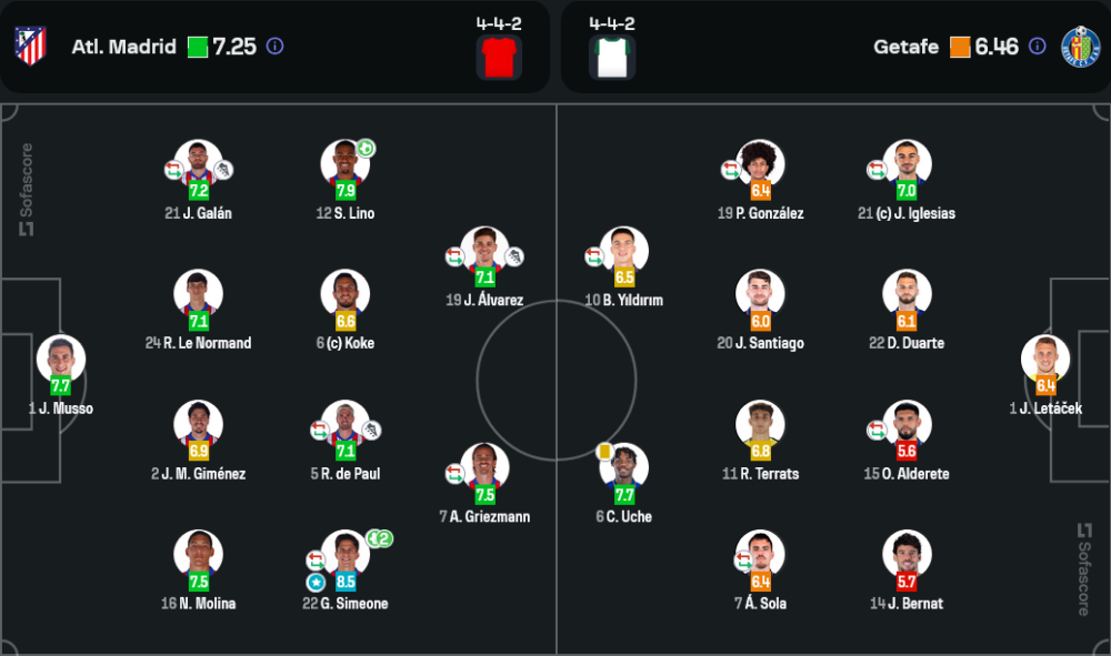 แอตเลติโก มาดริด มาในแผน 4-4-2 ที่เน้นเกมรุกแบบกดดันสูง ใช้ปีกอย่าง ลิโน่ และ กาลัน เติมเกมรุกอย่างต่อเนื่อง สร้างโอกาสในการเจาะเกมรับของเคตาเฟ่ได้อย่างมีประสิทธิภาพ การประสานงานระหว่าง เดอ ปอล, กรีซมันน์ และ ซิเมโอเน่ ถือเป็นจุดเด่นที่สร้างความแตกต่างในเกมนี้ เกมรับก็เหนียวแน่น คุมพื้นที่และจัดการกับการโจมตีของเคตาเฟ่ได้ดีเยี่ยม