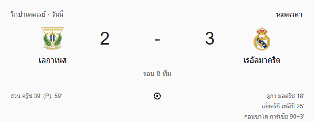 นาทีที่ 95: กรรมการเป่านกหวีดจบเกม เรอัล มาดริดบุกมาเอาชนะเลกาเนส 3-2