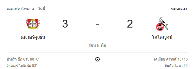 - นาทีที่ 98 วิคเตอร์ โบนิเฟซ ยิงให้เลเวอร์คูเซ่นขึ้นนำ 3-2