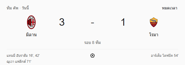 นาทีที่ 94: กรรมการเป่านกหวีดจบเกม เอซี มิลานเอาชนะโรม่า 3-1