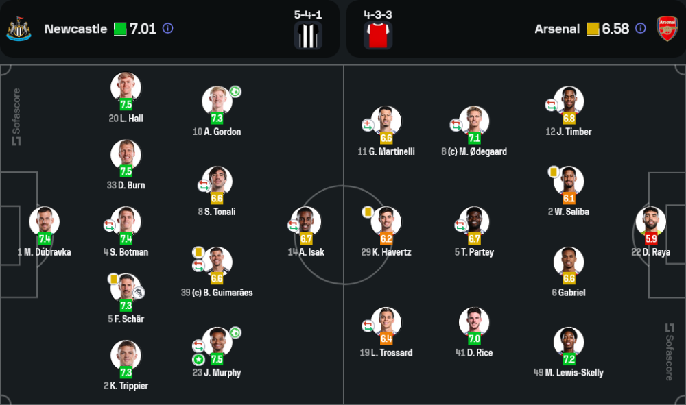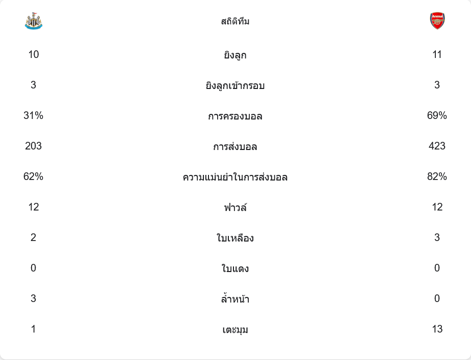 แม้อาร์เซนอลจะมีเปอร์เซ็นต์การครองบอลถึง 69% และผ่านบอลมากกว่า 400 ครั้ง แต่กลับไม่สามารถเปลี่ยนเป็นประตูได้ ต่างจากนิวคาสเซิ่ลที่แม้จะครองบอลเพียง 31% แต่มีจังหวะเข้าทำที่เฉียบคมกว่า ทั้งสองทีมมีโอกาสยิงเข้ากรอบเท่ากัน 3 ครั้ง แต่ความแตกต่างคือการจบสกอร์ที่มีประสิทธิภาพของเจ้าบ้าน