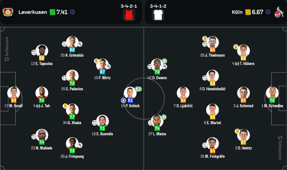 เกมเริ่มต้นด้วยการครองบอลของเลเวอร์คูเซิน แต่กลับเป็นโคโลญจน์ที่ฉวยโอกาสทำประตูได้ก่อนในช่วงทดเวลาบาดเจ็บนาทีที่ 45+10 จากจังหวะของ เดเมียน ดาวน์ส ที่ซัดเข้าไปอย่างเฉียบคม ทำให้ทีมเยือนออกนำ 1-0 ในครึ่งแรก แม้ว่าเลเวอร์คูเซินจะพยายามบุกอย่างหนักแต่ไม่สามารถเจาะแนวรับของโคโลญจน์ได้