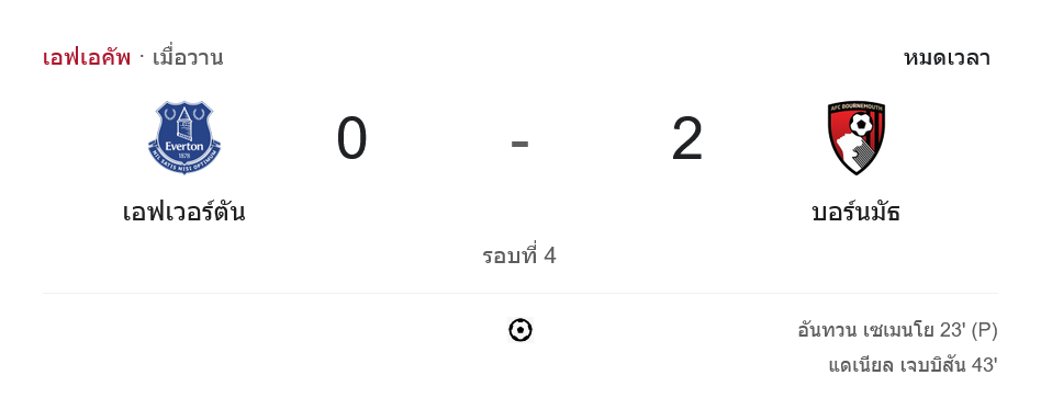 ท้ายเกม เอฟเวอร์ตันพยายามทวงประตูตีตื้น แต่สุดท้ายจบ 90 นาที บอร์นมัธ บุกมาชนะ 2-0 ทะลุเข้าสู่รอบต่อไปของ เอฟเอ คัพ 2024 ได้สำเร็จ